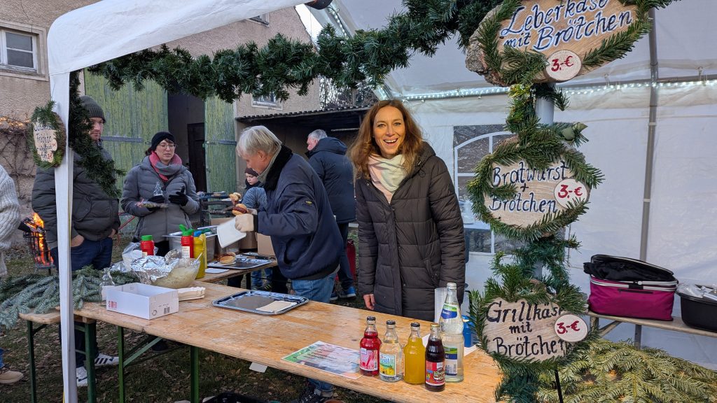 Die Marktstände boten eine vielseitige Auswahl: weihnachtliche Dekoartikel der Bernburger Märkte, handgefertigte Makramee-Dekorationen, Filzprodukte, regionaler Imkerhonig von Marika Groß, Fleischereiprodukte und natürlich Glühwein und Kinderpunsch für die kalten Hände. Der über dem offenen Feuer gegrillte Feuerlachs der Bildungswelten war ein besonderer Genuss und lockte viele Gäste an, ebenso wie der Grillstand des Berufsfachzentrums.