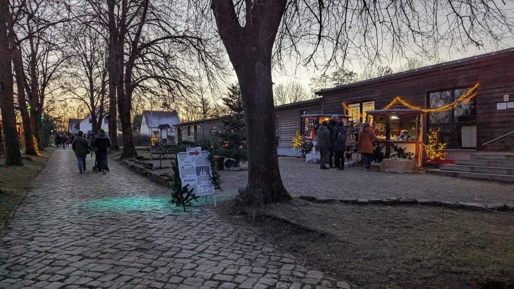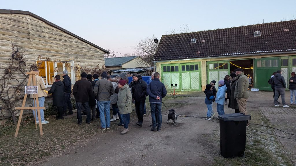 Schon beim Betreten des Geländes spürte man, wie liebevoll alles vorbereitet worden war. Lichterketten in den Bäumen, geschmückte Tannen und kleine Lichtinseln führten die Gäste über den Hof. Die Stände draußen waren jahreszeitlich geschmückt, sodass man sofort in weihnachtliche Stimmung eintauchte und gern zum Schlendern stehen blieb.