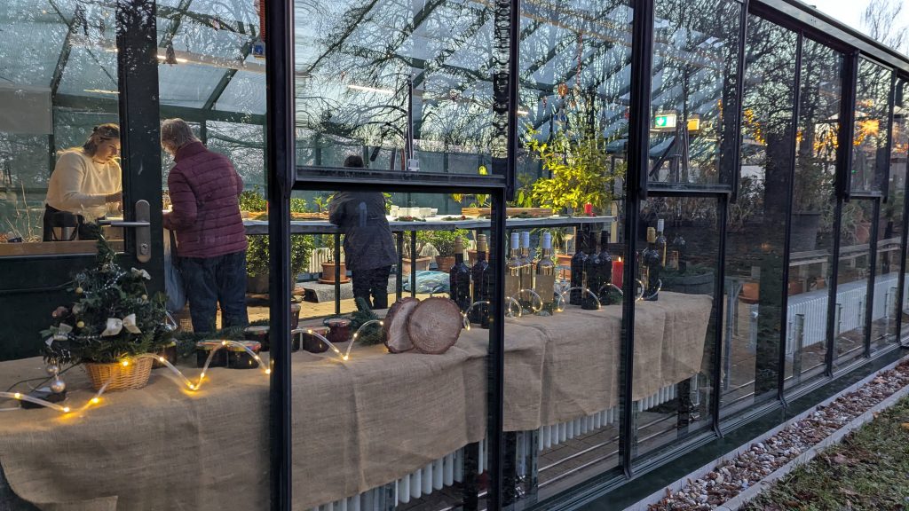 Im Gewächshaus erwartete die Besucher*innen eine gemütliche Kaffeestube mit Kuchen, Kerzenlicht und Pflanzen. Die Kombination aus Natur, Wärme und frisch gebackenem Kuchen lud zum Verweilen ein und bot eine entspannte Pause mitten im bunten Markttreiben.