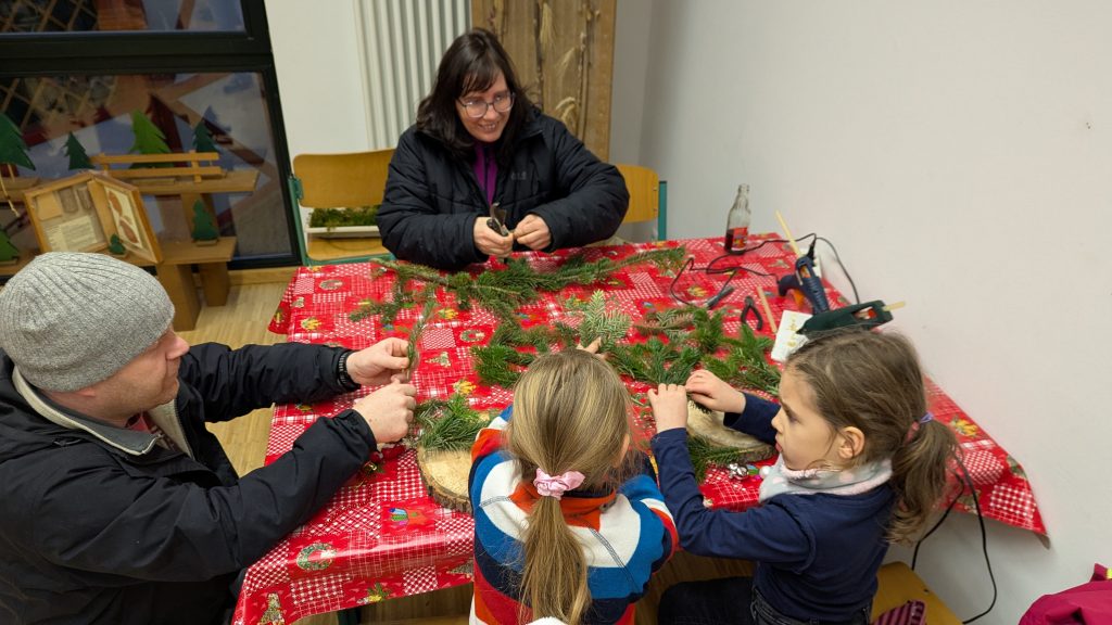 Auch drinnen wurde es kreativ: In den Räumen des Bildungsbereichs fand das allseits beliebte öffentliche Adventskranzbasteln statt. Unter der fachkundigen Anleitung von Frau Gollnick entstanden individuelle Adventskränze – mal klassisch, mal modern, immer liebevoll gestaltet. Viele Besucher*innen nutzten die Gelegenheit, ihren ganz eigenen Kranz mit nach Hause zu nehmen.